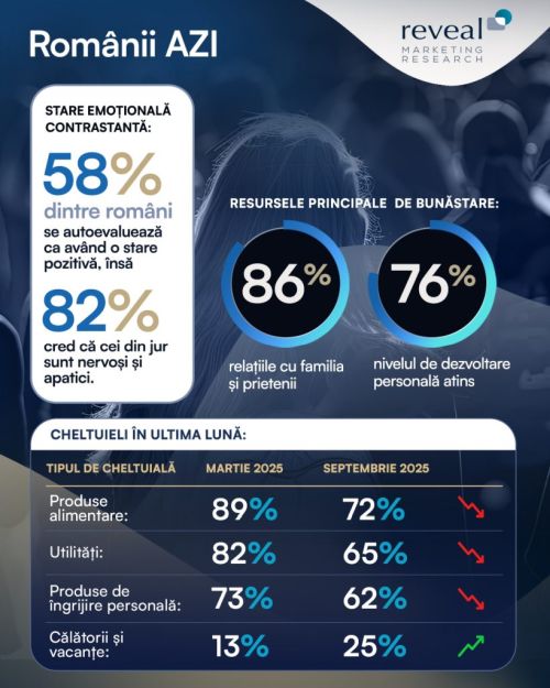 1 din 2 romani consideră că ceea ce cumpără in prezent reprezintă strictul necesar pentru a-și asigura traiul. Interesul pentru comunicări precise despre produse și prețuri din partea brandurilor crește la 36%, de la 27% in martie, releva cel mai recent studiu realizat de Reveal Marketing Research care a analizat starea actuală a romanilor, aspectele importante ale momentului, precum și evoluția acestora comparativ cu studiul similar desfăsurat in urmă cu 6 luni (martie 2025).