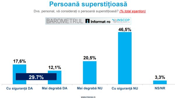 17.6% dintre participanții la sondaj se consideră cu siguranță persoane superstițioase. 12.1% spun că mai degrabă da, 20.5% mai degrabă nu, iar 46.5% cu siguranță nu sunt persoane superstițioase. Ponderea non-răspunsurilor este de 3.3%.
