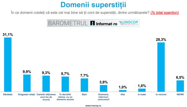 31.1% dintre romani sunt de părere că este cel mai bine să ții cont de superstiții in sănătate, 9.9% in dragoste/relații, 9.3% in carieră/obținerea unui loc de muncă, 8.7% in deciziile zilnice, nu un domeniu anume, 7.7% in bani, iar 3.9% in examene, interviuri, concursuri. 6.5% nu știu sau nu răspund.
