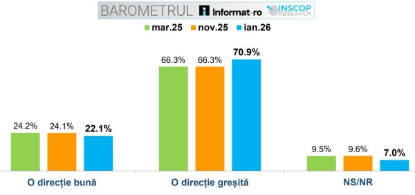22.1% dintre respondenți sunt de părere că lucrurile in Romania se indreaptă intr-o direcție bună (față de 24.2% in martie 2025 și 24.1% in noiembrie 2025). 70.9% cred că lucrurile merg intr-o direcție greșită (față de 66.3% in martie 2025 și 66.3% in noiembrie 2025), iar 7% nu știu sau nu răspund (față de 9.5% in martie 2025 și 9.6% in noiembrie 2025).
