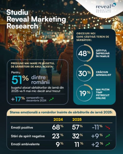 Conform rezultatelor studiului Reveal Marketing Research, romanii au sentimente preponderent pozitive in asteptarea sărbătorilor de iarnă (57%), cele mai des menționate emoții fiind optimismul (11%), mulțumirea (11%) și fericirea/ bucuria (9%).