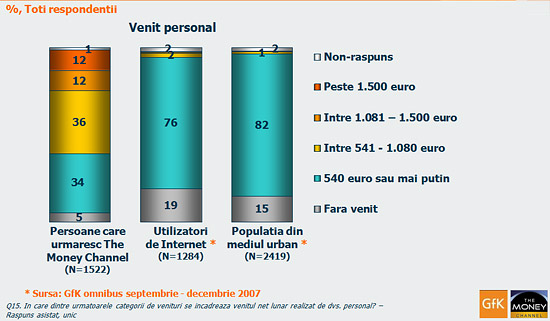 Unul din trei telespectatori The Money Channel recunoaste ca depaseste mia de euro pe luna, fata de 0,5% din populatia urbana. De asemenea, 37% dintre cei cu venituri intre 540 si 1000 de euro urmaresc The Money Channel mai mult de 10 ore pe saptamana.