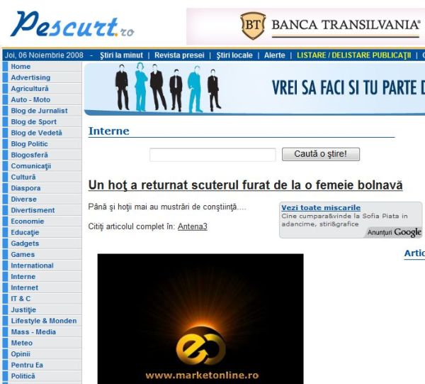 Daca publicatiile cu articolele originale sunt probabil prea scumpe, un al site, Freenews.ro, cu aproape 80.000 vizitatori unici si aproape 500.000 afisari, are nunumai Google AdSense ci si banner CEC Bank. Si daca nu v-am convins ca oamenii unor publicatii fac bani din publicitate online din articolele atent selectate din munca altora, incercati si Pescurt.ro, care aproape ca nu-si merita rolul in aceasta discutie pentru ca nu este atat de dibaci in arta multiplicarii paginilor per vizitator si nu reuseste sa faca decat 150.000 de pagini pe luna la cei 70.000 vizitatori unici.