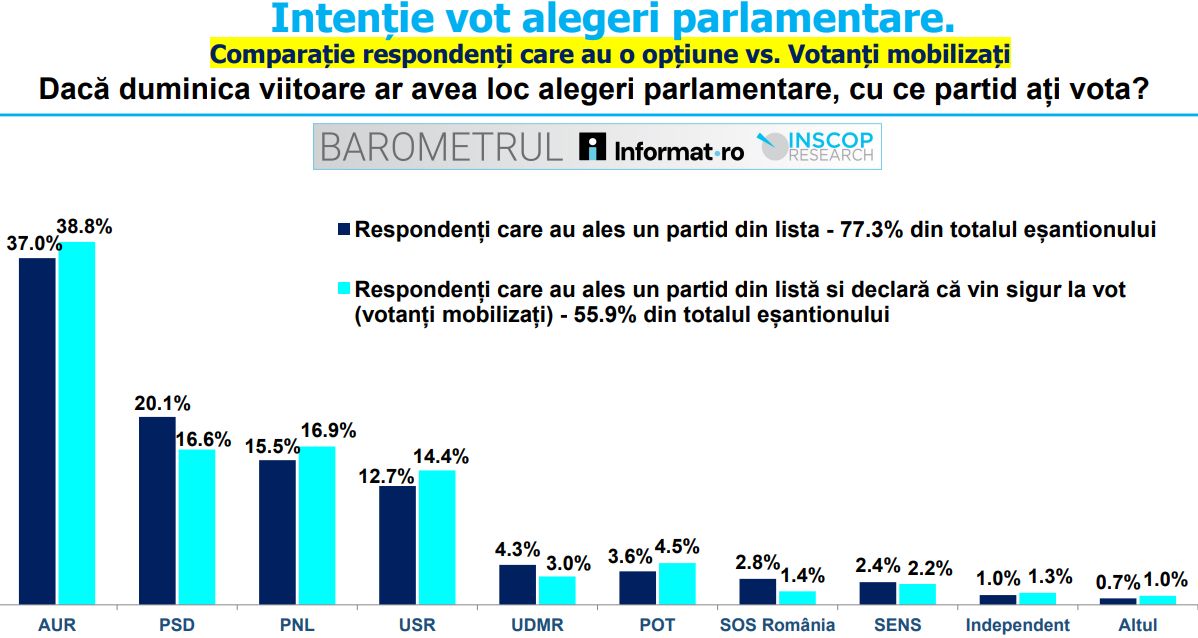 38.8% dintre cei care au exprimat o opțiune de vot ar vota cu AUR, 16.9% cu PNL, 16.6% cu PSD, 14.4% cu USR. Pentru UDMR ar opta 3% dintre alegători, pentru POT – 4.5%, pentru SOS Romania – 1.4%, iar pentru SENS – 2.2%. 1.3% dintre respondenți iși exprimă preferința pentru un candidat independent, iar 1% pentru alt partid.